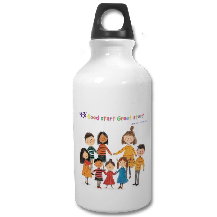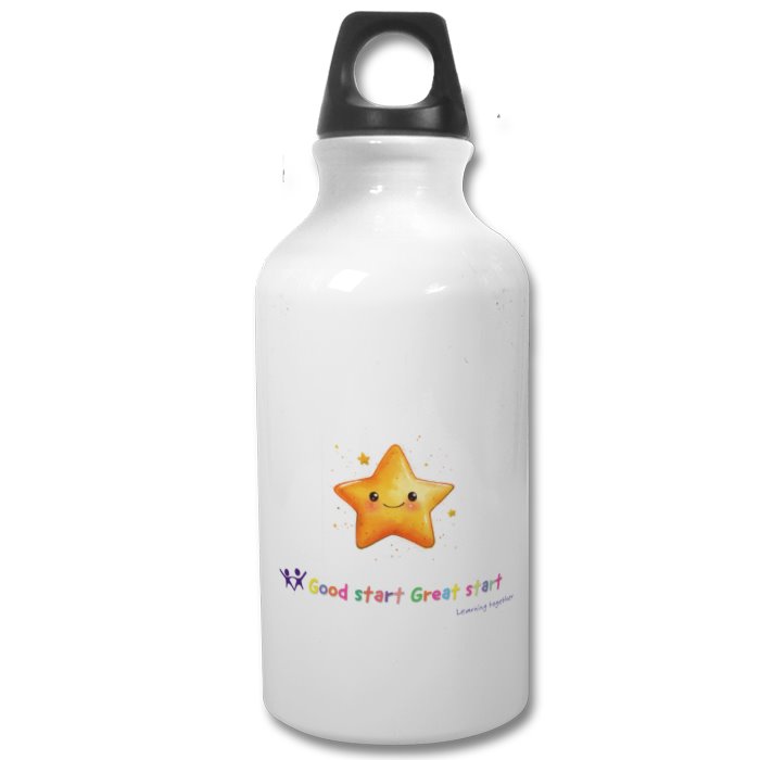 Small size drink bottle with a star logo on one side and the family logo on the other.