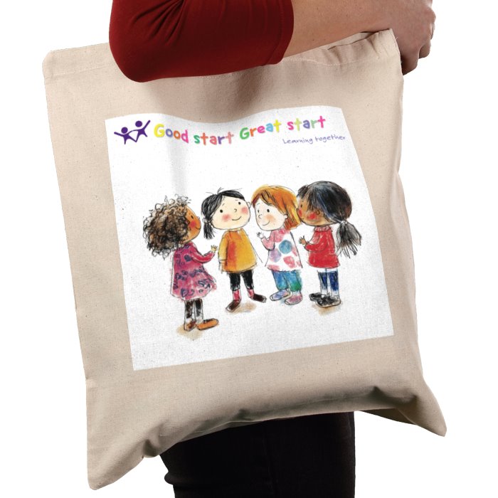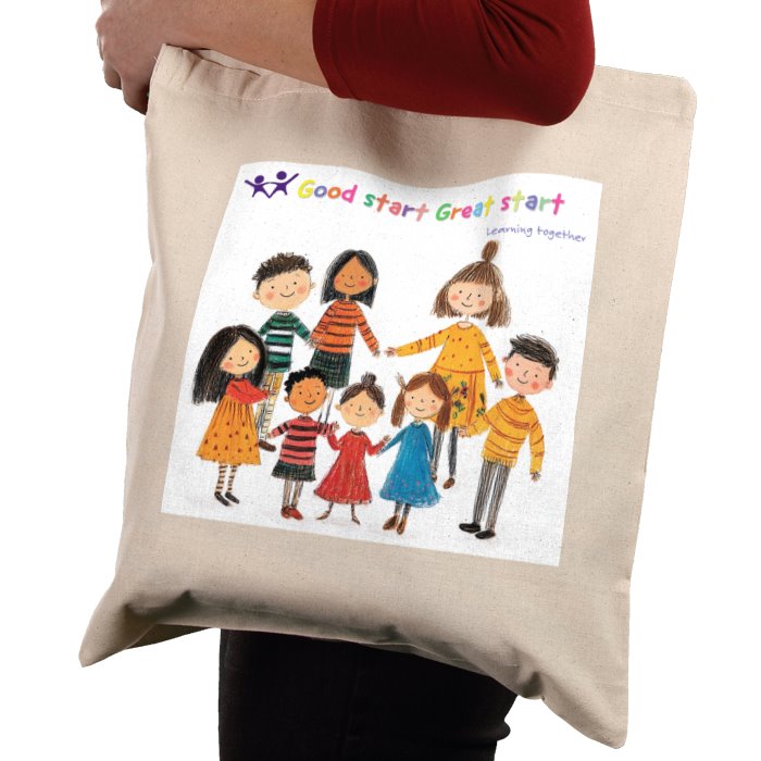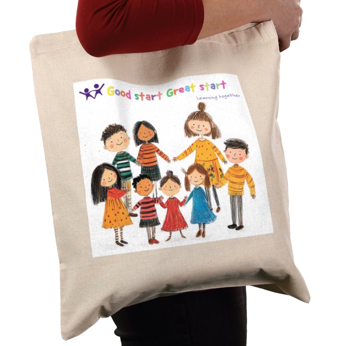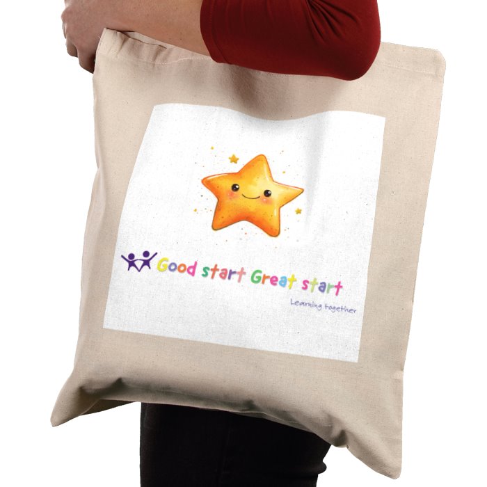 A pure cotton tote bag featuring the children logo on one side and the star logo on the other