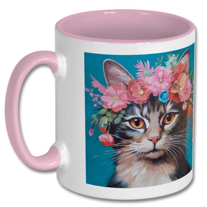 Quality glossy mug with pink trim and interior and a lovely kitten on both sides.