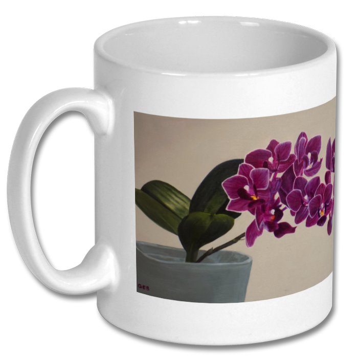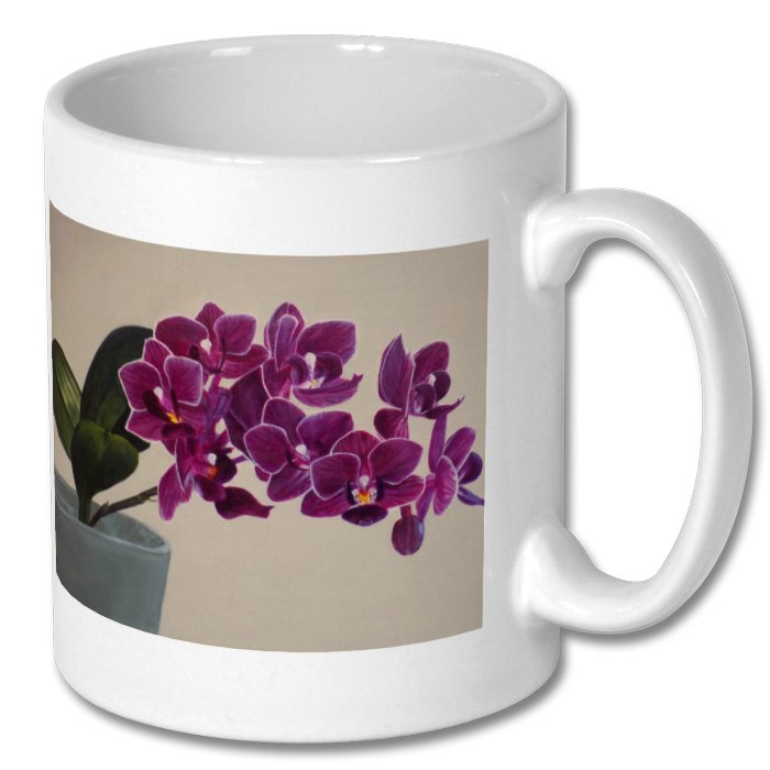 Orchid painting printed onto white mug. My own artwork, painting by Gemma Bradshaw. Printed image on left side of mugs handle. Strong white mug with my artwork printed. Glossy photo quality finish. Dishwasher & microwave safe -UV resistant -High definition colour -Height 9cm, diameter 8cm -Print area (both sides) : 8.15cm wide, 8cm high -Print area (full-wrap designs) : 20.15cm wide, 8cm high -Capacity 10oz