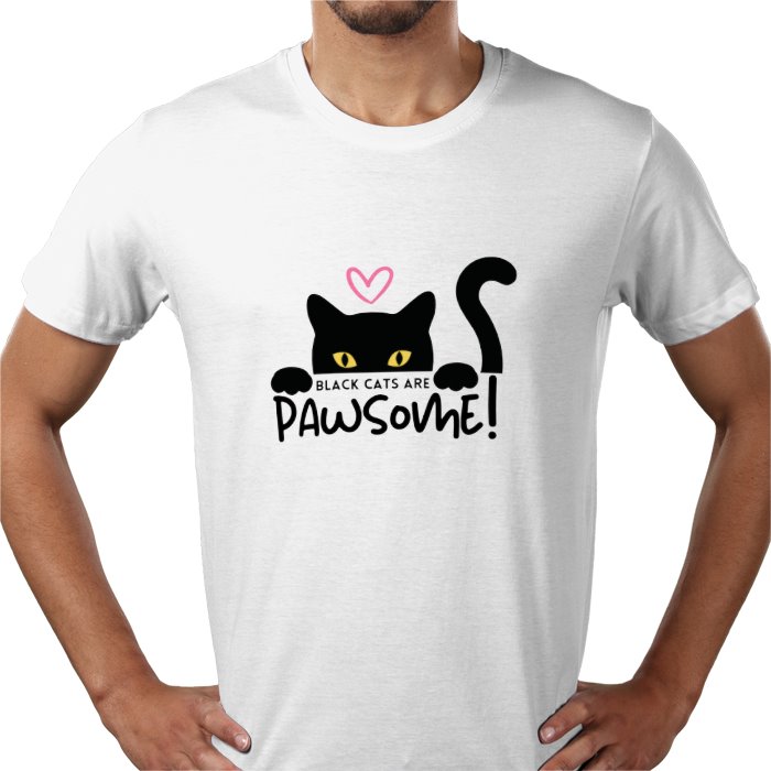 High Quality Printed White Value T-Shirt with BLACK CATS ARE PAWSOME! design.