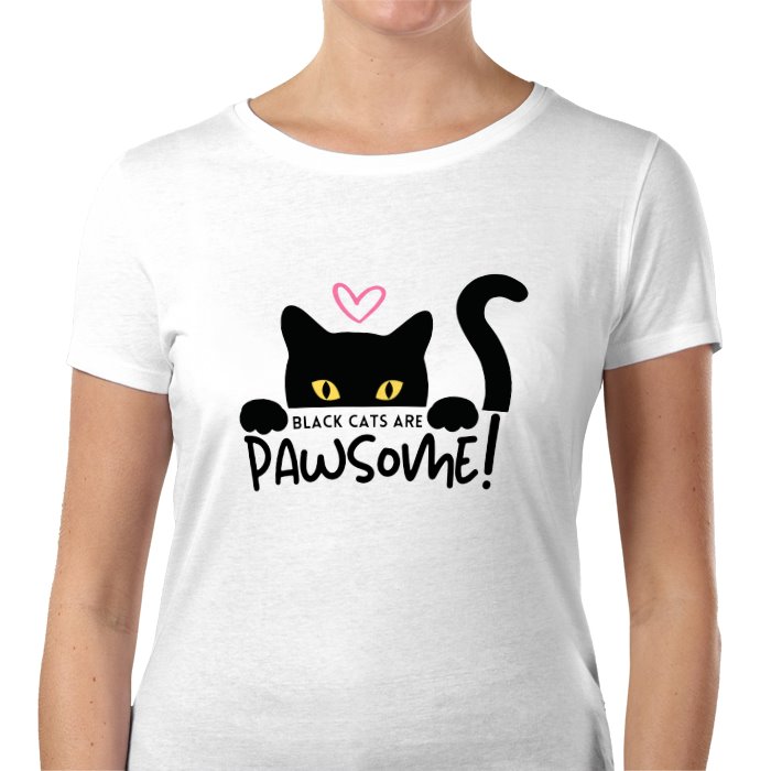 High Quality Printed White Value T-Shirt with BLACK CATS ARE PAWSOME! design. FITTED