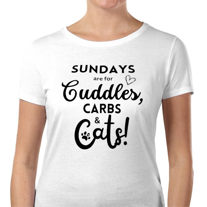 High Quality Printed White Value T-Shirt with SUNDAYS ARE FOR CUDDLES, CARBS, & CATS design. FITTED