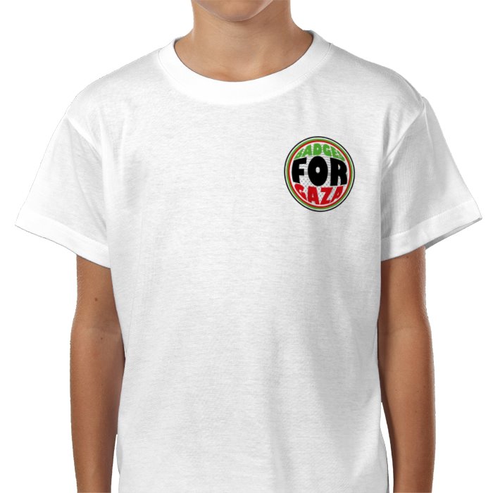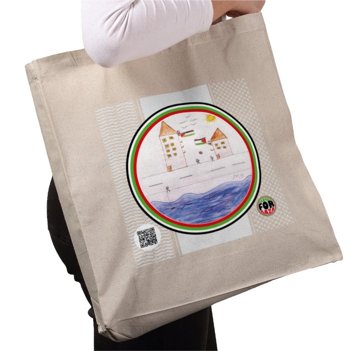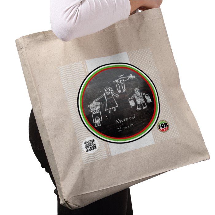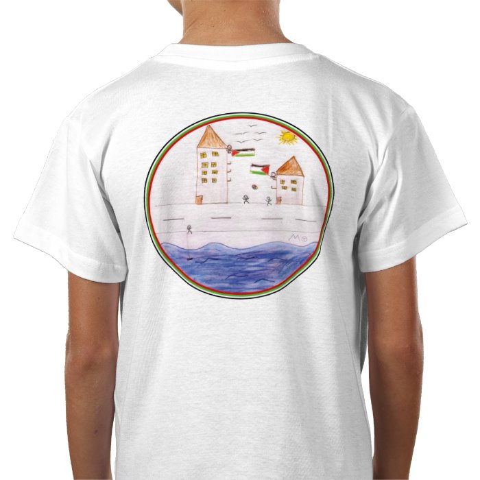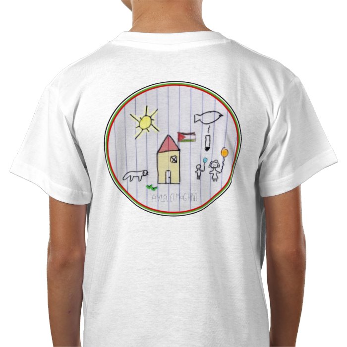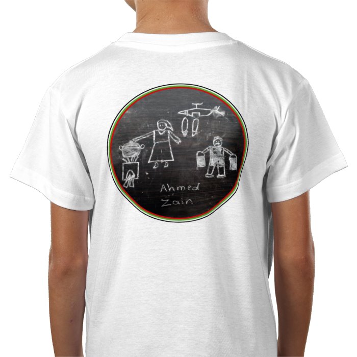 Cotton T-shirt. Sizes (cm's) by age: 3-4 L46 x W36, 5-6 L52 x W41, 7-8 L56 x W43, 9-11 L60 x W46, 12-14 63.3 Ahmed, 9 years old and his brother Zain, 7 years old, live with their older brother and sister in a tent in the South of Gaza. They found a tiny piece of chalk and a plank of wood for the fire, and made this drawing about their life.