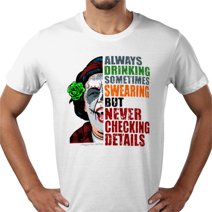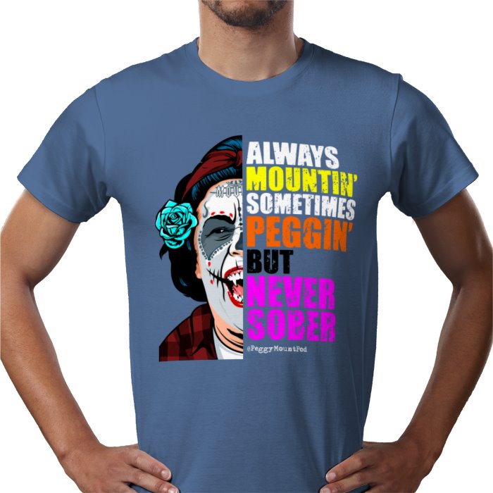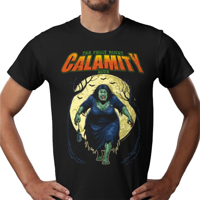 An official Peggy Mount Calamity Hour podcast Tee, incorporating the After Dark theme.