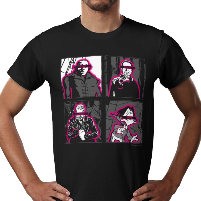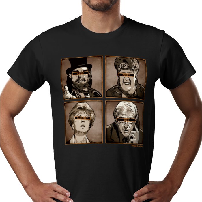 An official Peggy Mount Calamity Hour podcast Tee, with the visual flavour of your favourite Saturday morning TV show.