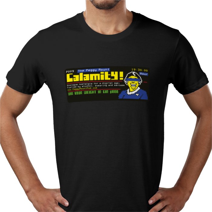 An official Peggy Mount Calamity Hour podcast Tee, styled in the fashion of your favourite retro online telly information service.