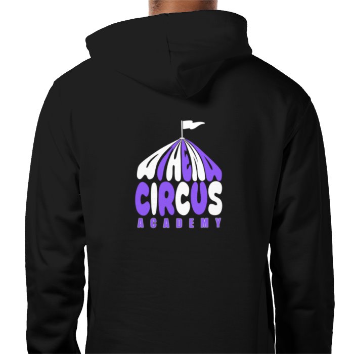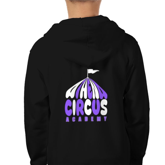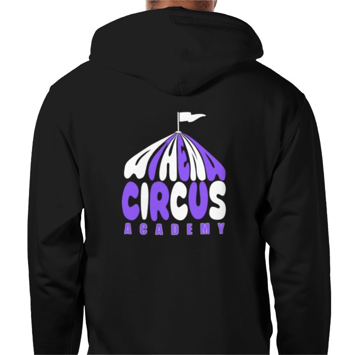 Athena Circus Academy logo hoodie with zip, circus tent design on back