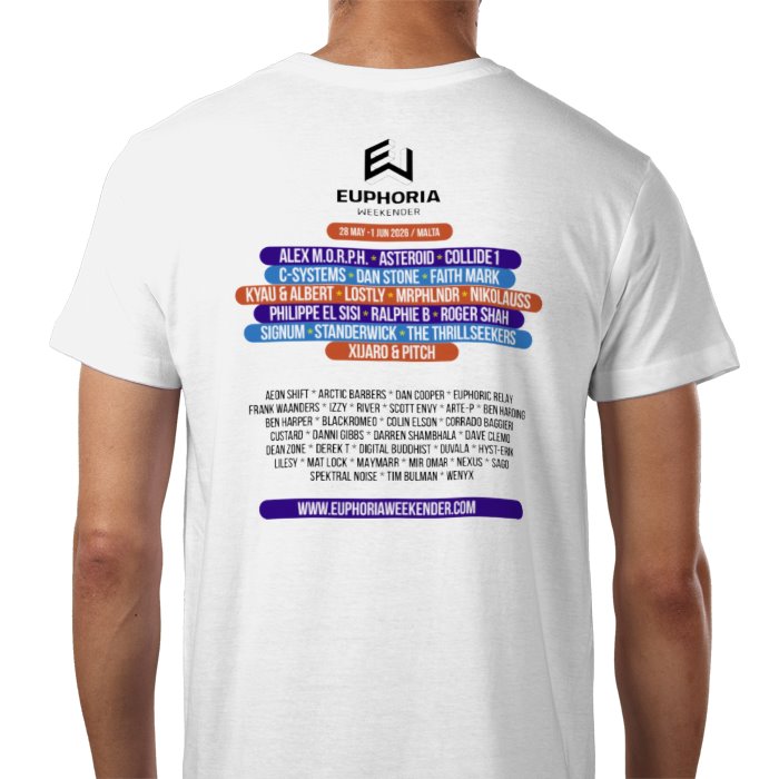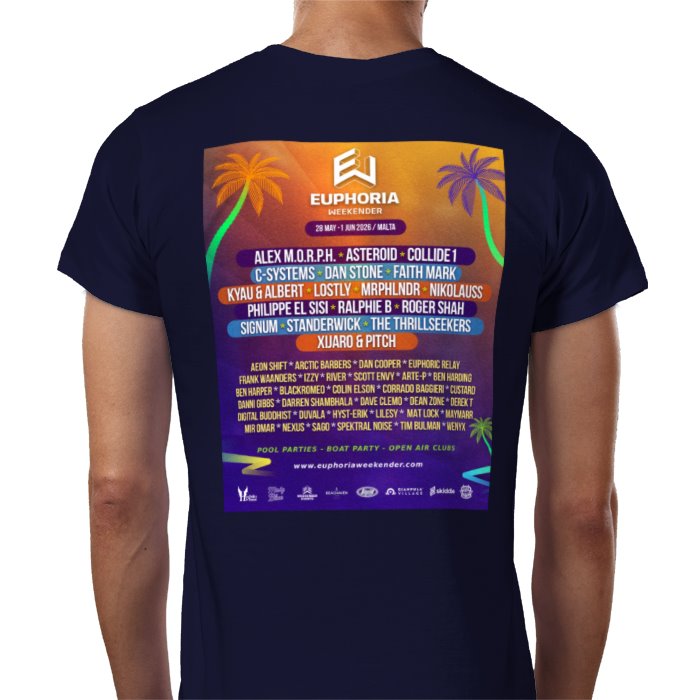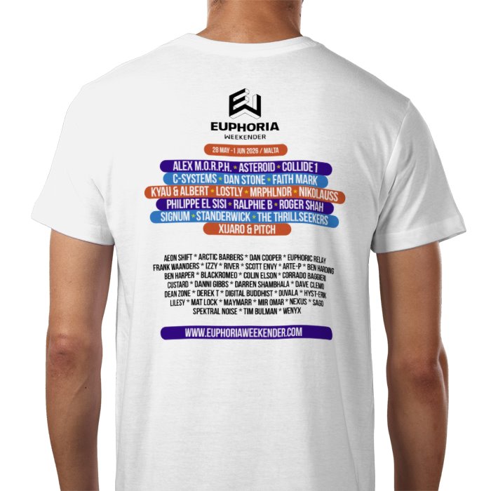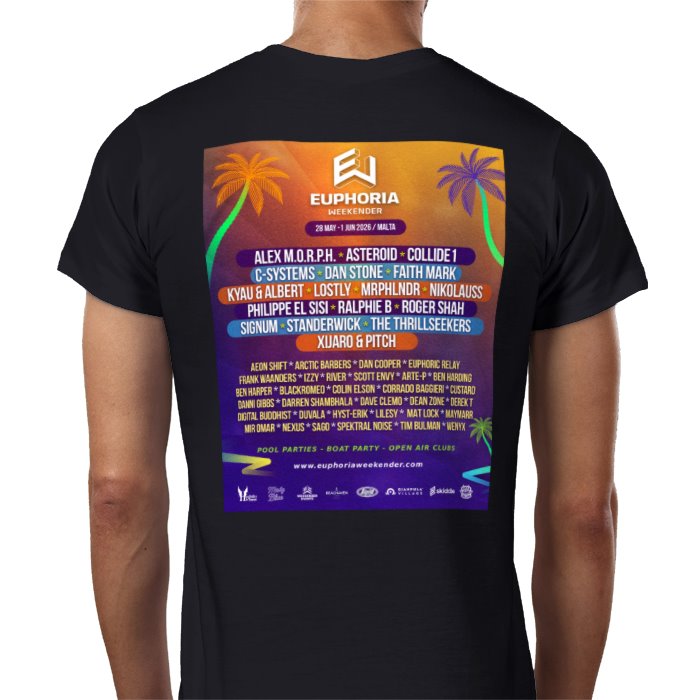 EW 2026 Black T-shirt with the DJ line-up on the back.100% CottonContemporary fitFine gauge knit185gsmShoulder to shoulder tapingFront coverseaming on collarTo fit chest: S 36/38" M 38/40" L 41/42" XL 43/44" 2XL 45/47" 3XL 47/49" 4XL 49/51"