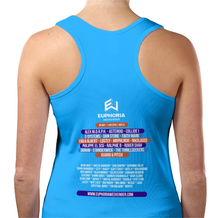EW 2026 - Women's Aqua Sports Tank Top (Fitted) with djs listed on the back.