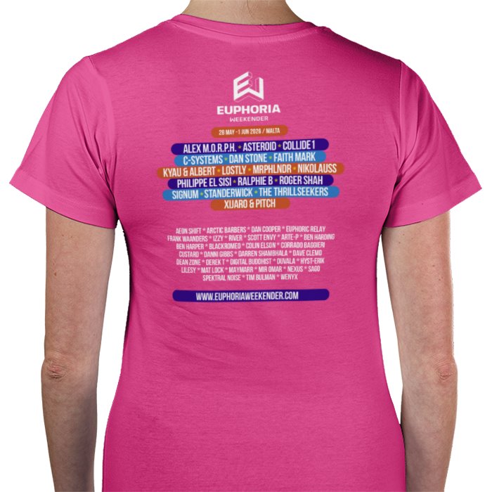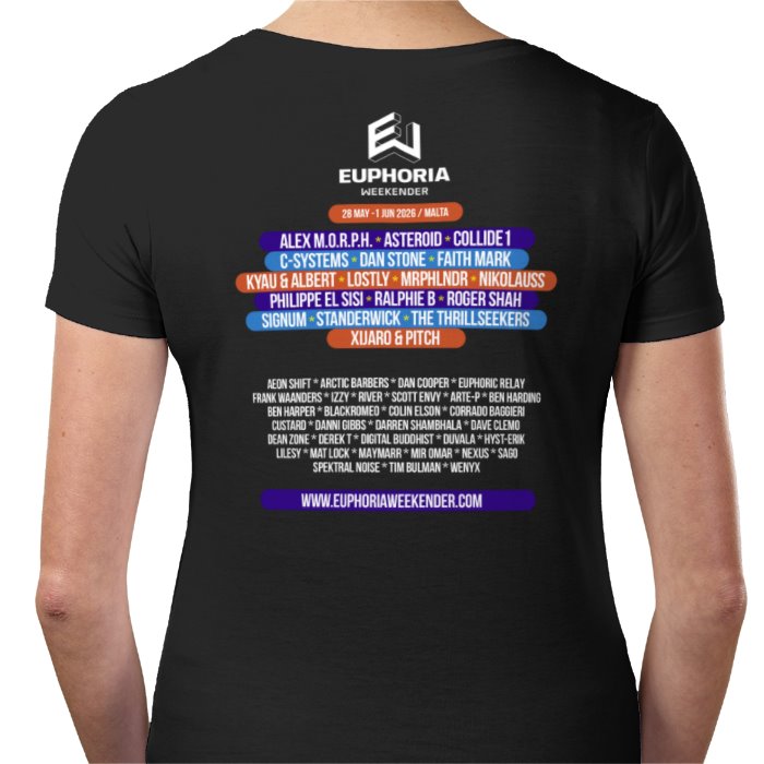 EW 2026 Women's Black T-shirt with large front logo and the DJ line-up on the back.