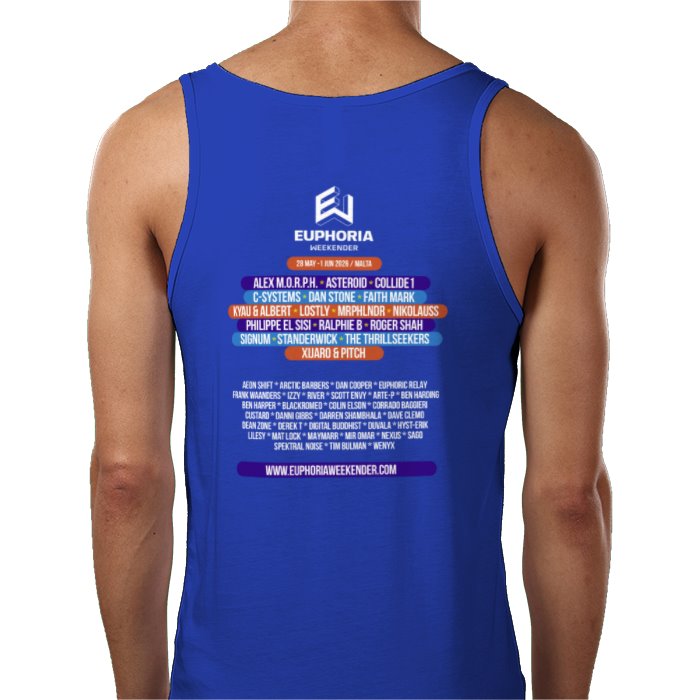 EW 2026 Blue Men's Tank Top with front logo and the DJ line-up on the back.