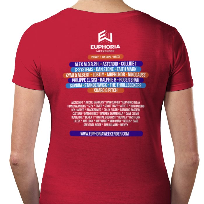 EW 2026 Red T-shirt with large logo on the front and the DJ line-up on the back.