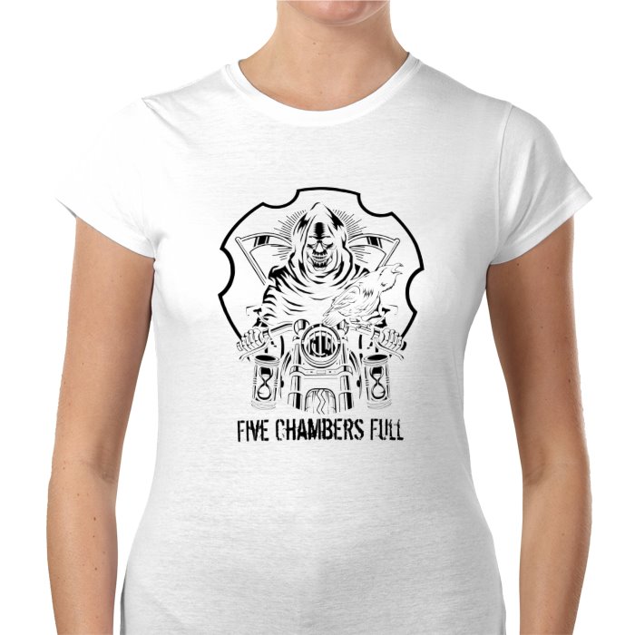 Take a ride with the reaper and watch your life flash before your eyes. Five Chambers Full are known for giving the kind of full throttle performances that wouldn't be out of place during the fastest of motorsports. Represent the high-octane nature of Five Chambers Full with this stylish t-shirt but don't forget your helmet.