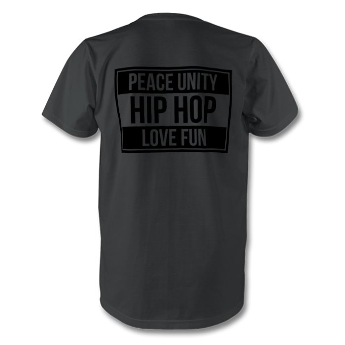 100% organic cotton tee with G Commodity chest logo and HIP knowledge and HOP culture back design based on 4 of the known elements:PEACEUNITYLOVEFUN