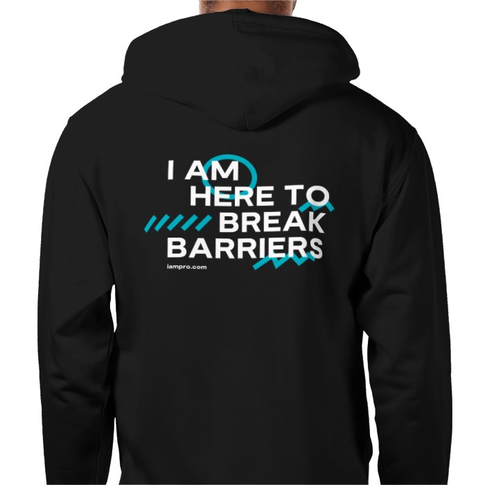 iampro "I Am Here to Break Barriers" Hoodie featuring the iampro logo on the front and large "I Am Here to Break Barriers" design on the back.
