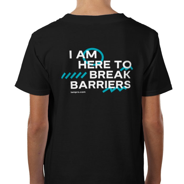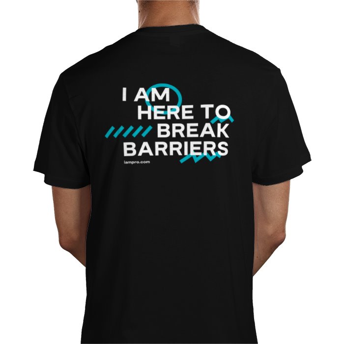 iampro "I Am Here to Break Barriers" T-Shirt featuring the iampro logo on the front and large "I Am Here to Break Barriers" design on the back.
