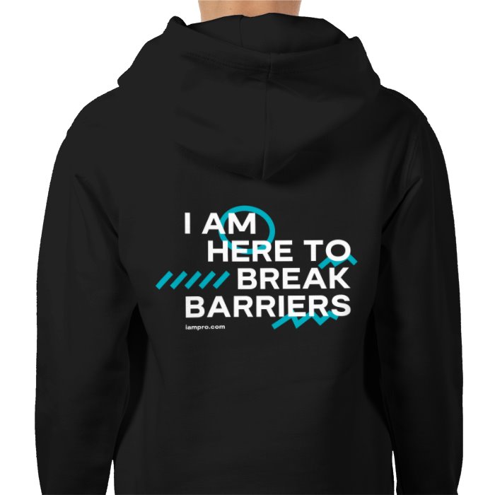 iampro "I Am Here to Break Barriers" Zip Hoodie featuring the iampro logo on the front and large "I Am Here to Break Barriers" design on the back.