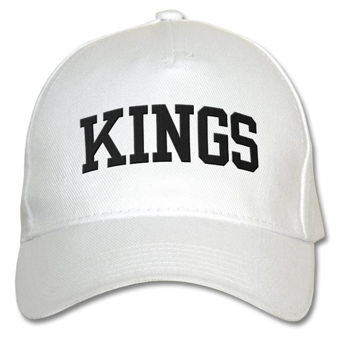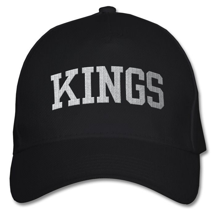 A baseball cap with the Kings name in black.
