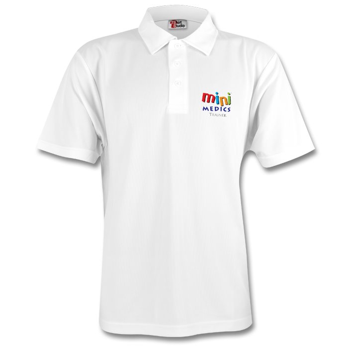 A premium quality unisex Polo shirt in light grey with Mini Medics Trainer printed of front side only. Choose from sizes available.