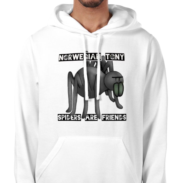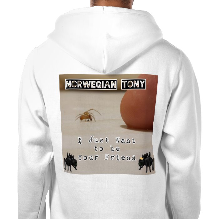 Printed front and back hoodie. Norwegian Tony logo. Tube Web spider logo front. Tiny spider on back.