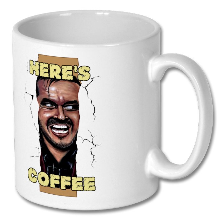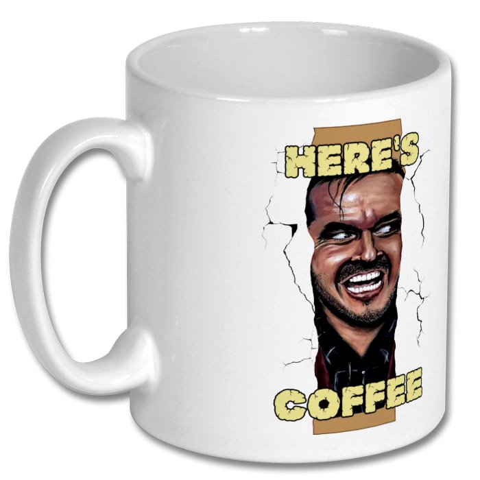 Based upon my original painting of the famous scene from the movie "The Shining" this is the perfect mug for coffee lovers or fans of the film, with its amusing twist on the quote "Here's Johnny!"