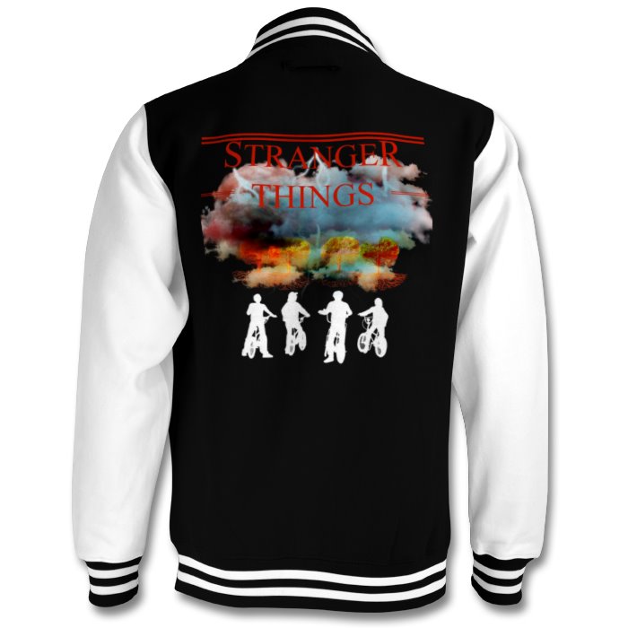 "Stranger Things" - Quality Varsity College Jacket. 80% Cotton, 20% Polyester 330gsm Press stud closure Knitted collar, cuffs and waistband with stripe details Contrast sleeves Hidden Earphone loops and hole for cable. Warm and fashionable To fit chest: XS 32" S 34" M 38" L 42" XL 46" 2XL 50" WRAP certified product (Worldwide Responsible Accredited Production)