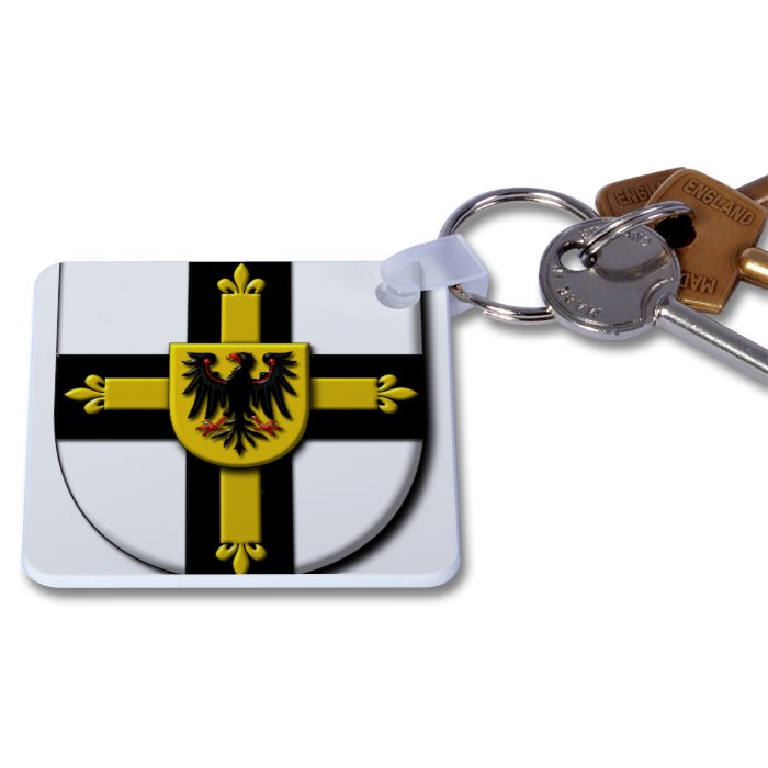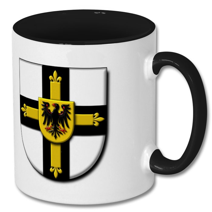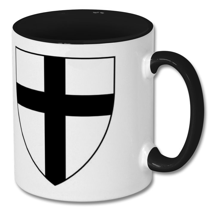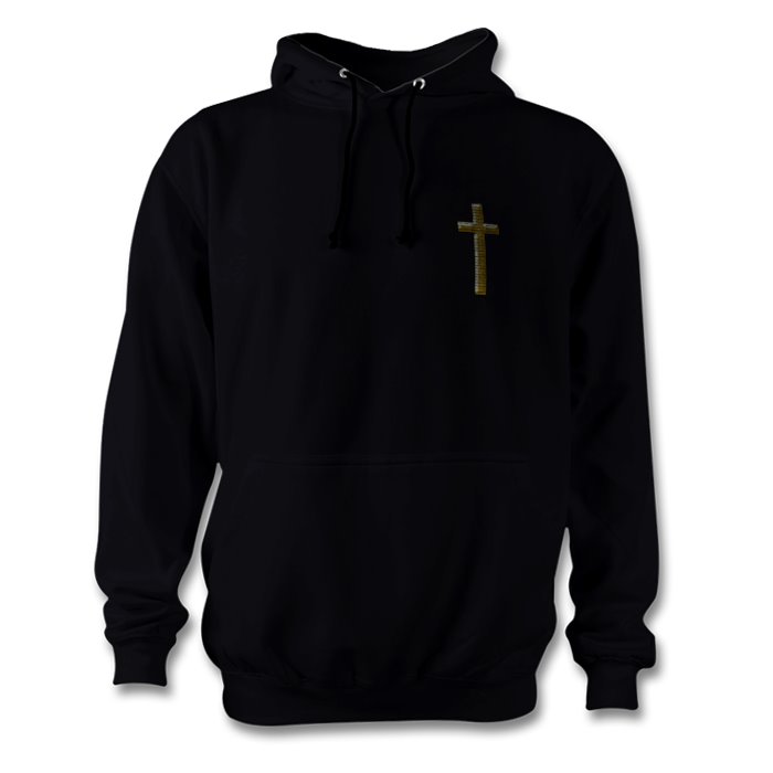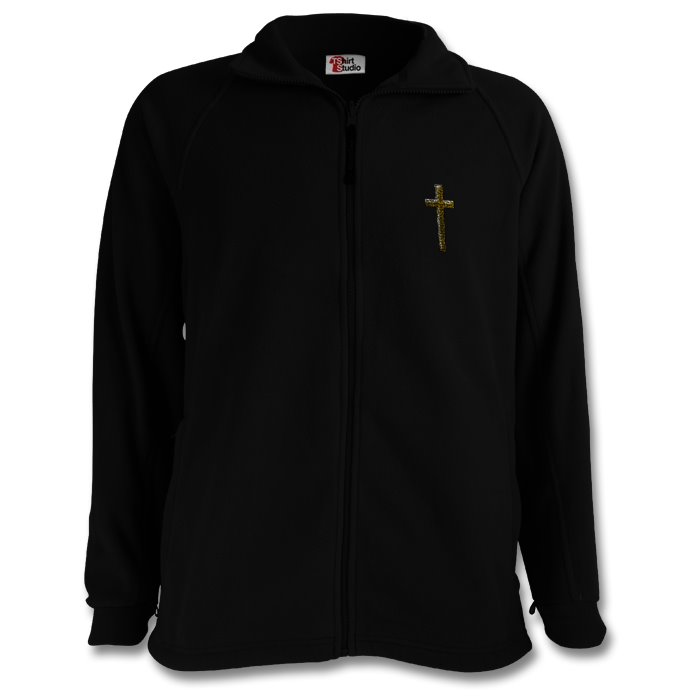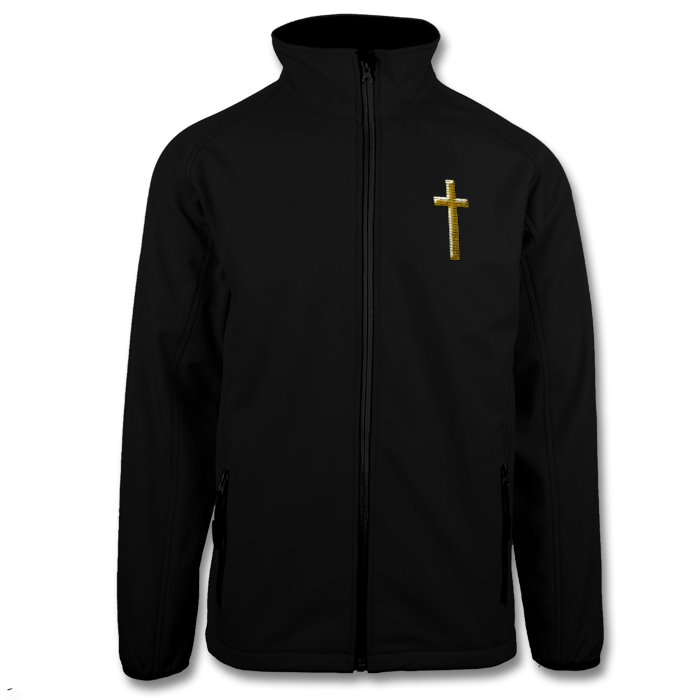 Black soft shell jacket with an embroidered gold cross on the left breast