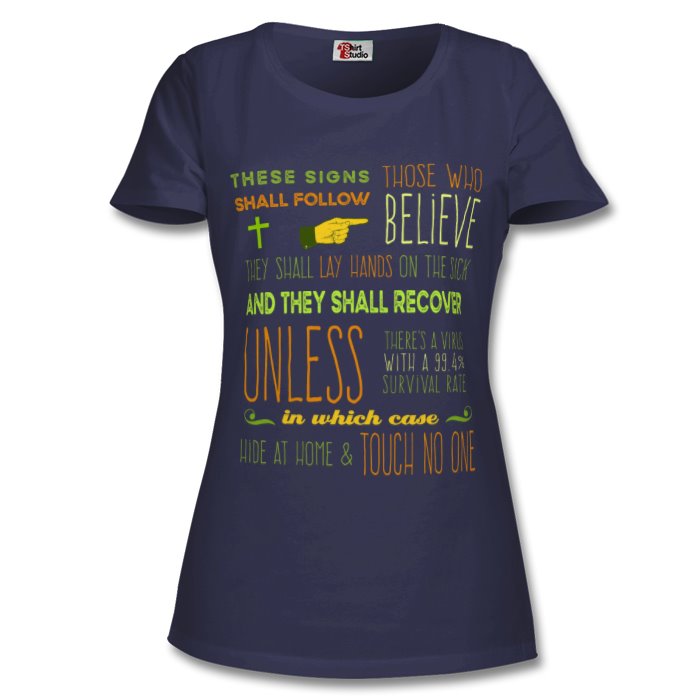 This Very Slightly Sarcastic t-shirt reads: "These signs shall follow those who believe: they shall lay hands on the sick and they shall recover. UNLESS there's a virus with a 99.4% survival rate, in which case HIDE AT HOME and TOUCH NO ONE." ∙ ∙ ∙ ∙ ∙ ∙ ∙ ∙