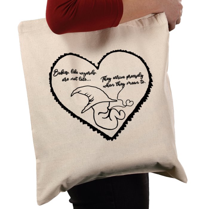 Babies, like wizards are not late.. They arrive precisely when they mean to. Black on tote bag