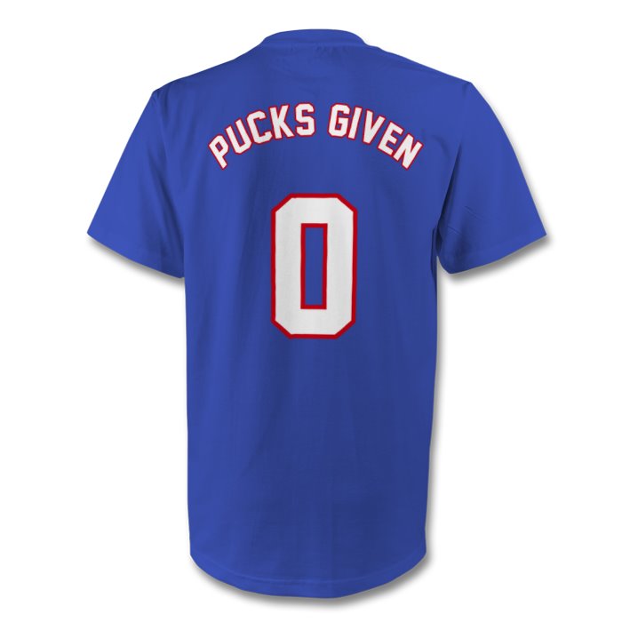 100% Cotton T-Shirt in Blue with large front logo and “0 PUCKS GIVEN” on reverse